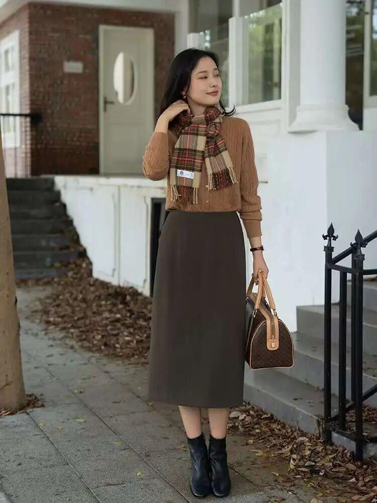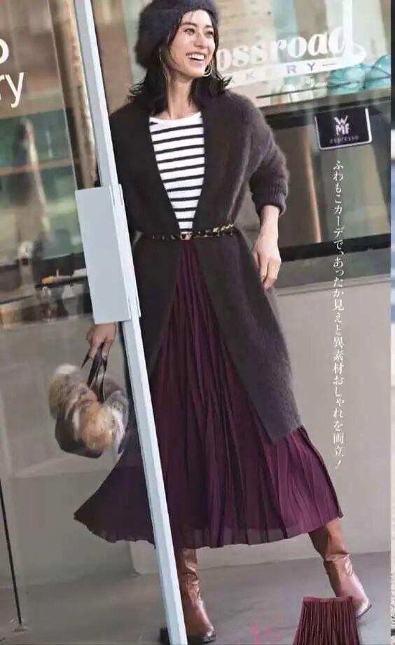 针织直筒裙不挑身材、不挑年龄、不挑场合。咱们都能轻松驾驭。搭配风衣,不用费心思思考配色与款式,随便一套就能出门,省时又省力。