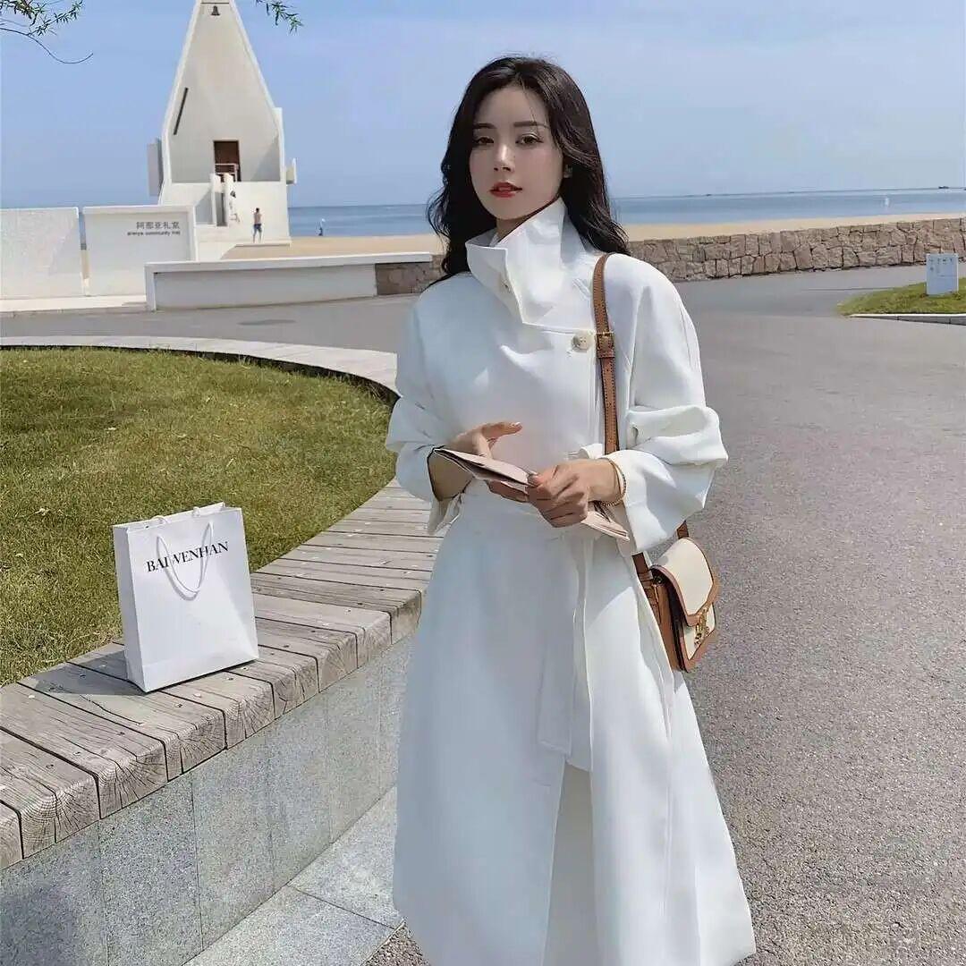 同色系搭配,就是风衣和裙装选择相近的颜色,比如卡其色风衣配米色裙、黑色风衣配深灰裙、燕麦色风衣配白色裙等,整体色调统一、和谐、干净。