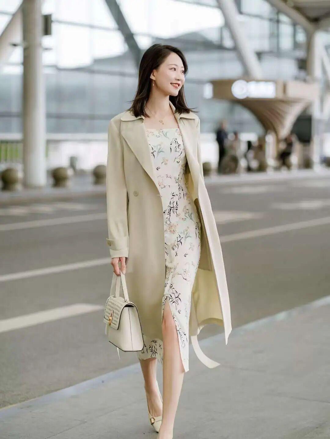 和风衣搭配在一起,敞开风衣穿,内搭的裹身裙露出腰线,整个人看起来轻巧又纤细,完全不会有拖沓、笨重的感觉。